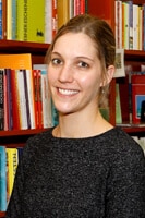 Porträt einer Frau mit zurückgebundenen, hellbraunen Haaren. Sie trägt ein dunkelgraues Oberteil und steht vor einem Bücherregal mit bunten Buchrücken. Sie lächelt offen in die Kamera.